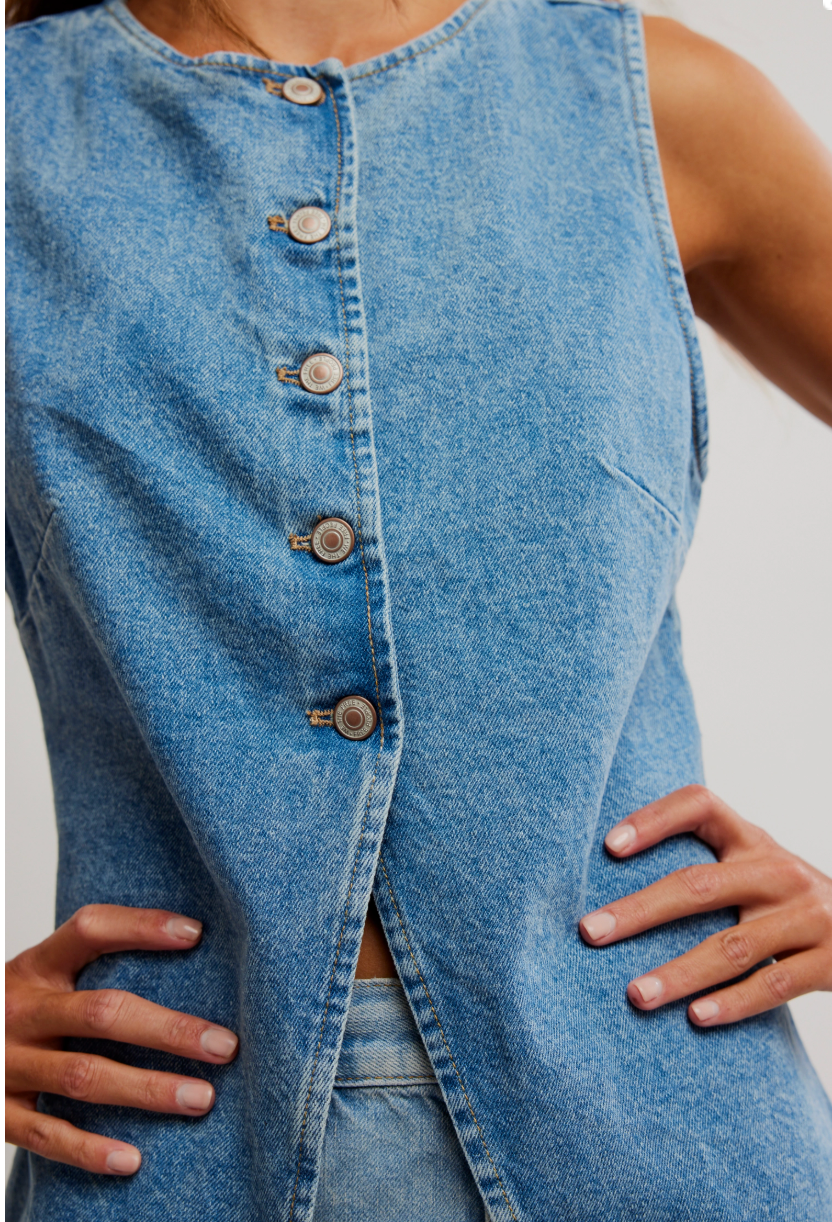The Aimee Vest is your new go-to layer for effortless cool. This Free People denim vest features an open bottom design that lets you style it your way—throw it over your favorite tee, dress it up with a blouse, or rock it solo for that perfectly undone vibe. Crafted from quality denim, it's the versatile piece every boho wardrobe needs. Dress it down or dress it up—the Aimee does it all.