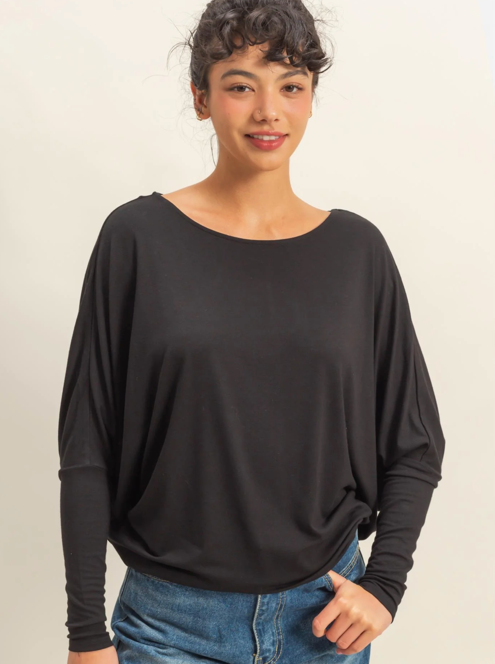 This Chic Dolman Sleeve Top Offers A Relaxed Fit With A Round Neckline, Perfect For Casual Days Or Dressing Up For An Evening Out. The Dolman Sleeves Provide A Loose And Comfortable Fit Through The Arms, Tapering Into Fitted Long Sleeves. The Top Drapes Beautifully Over The Body, Creating A Flattering Silhouette. Pair It With Jeans Or A Skirt For A Stylish And Effortless Look. This Versatile Piece Can Be Dressed Up With Accessories Or Worn Simply For A More Casual Vibe. A Must-Have Addition To Your Wardrobe For All Seasons.