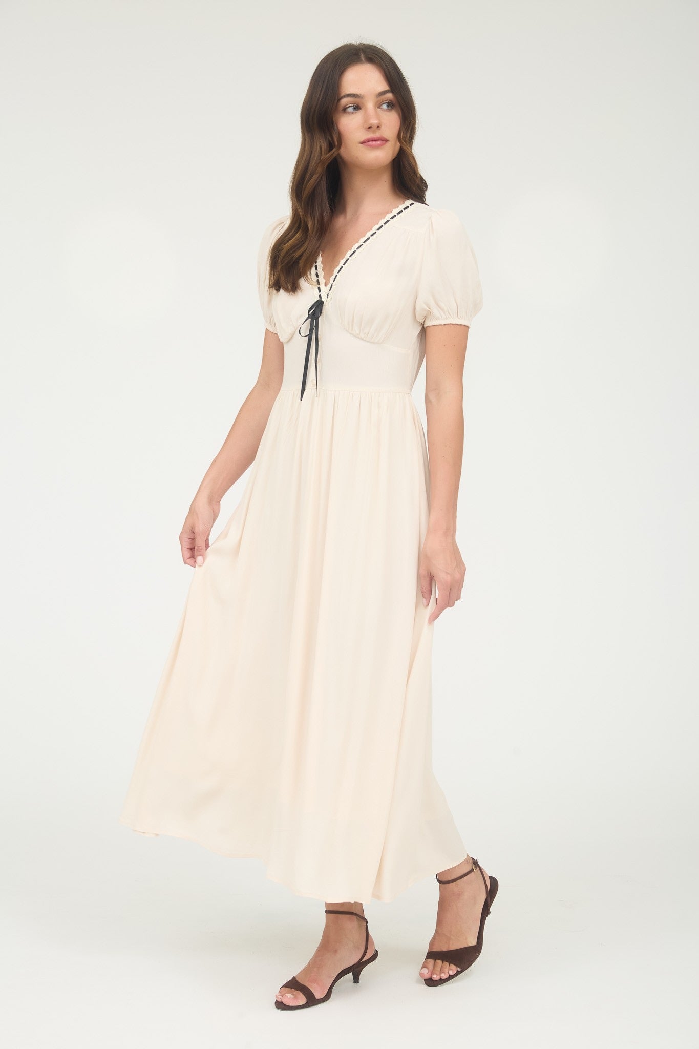 Playfully feminine, the Claire Lace Trim Dress features delicate lace edging and a flattering fitted waist that highlights your silhouette. Its charming V neckline and front tie detail add a flirty touch, while short puff sleeves keep the look light and breezy. Perfect for sunny days or casual outings, this dress brings a fresh, fun vibe to your wardrobe.