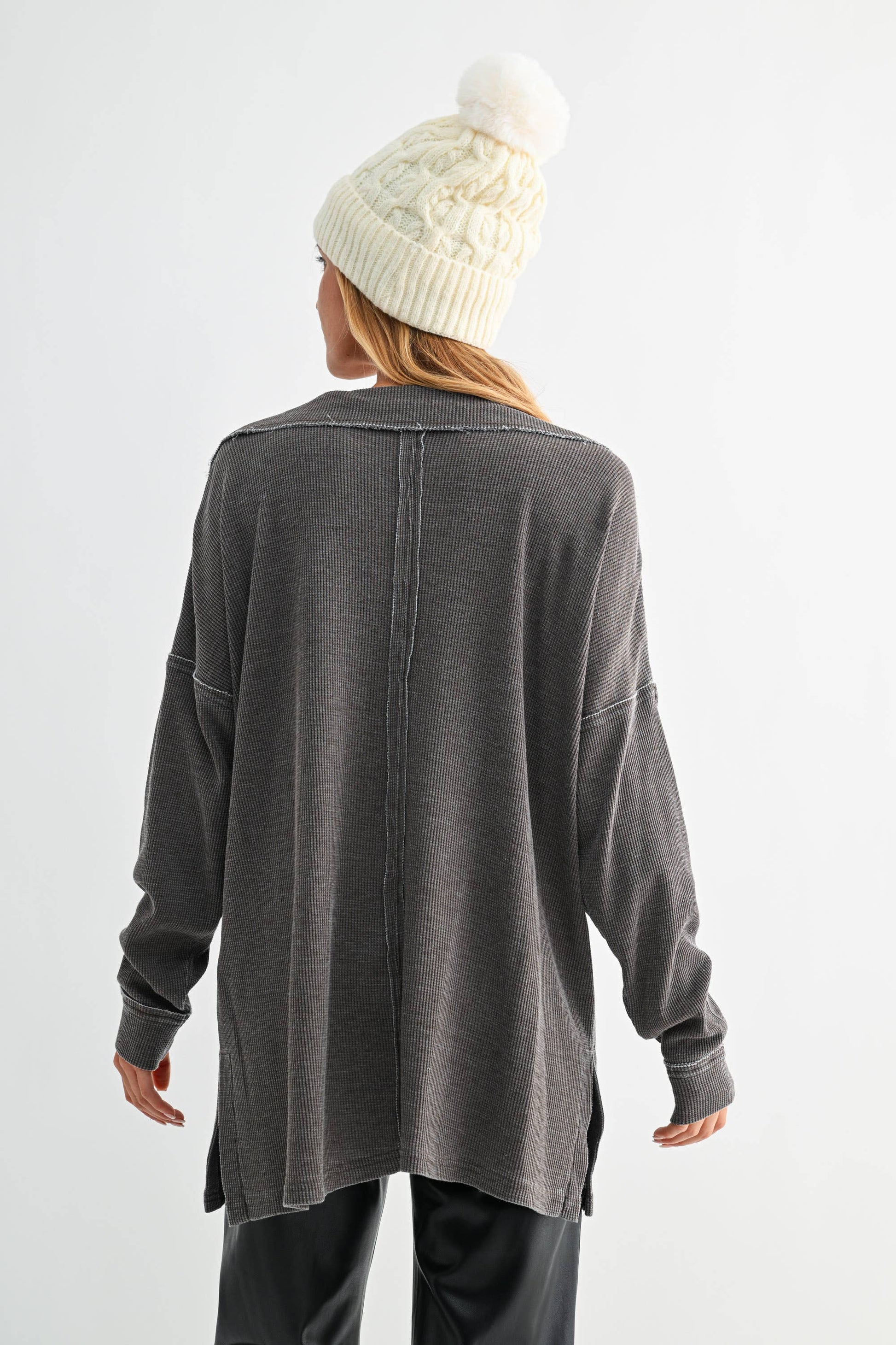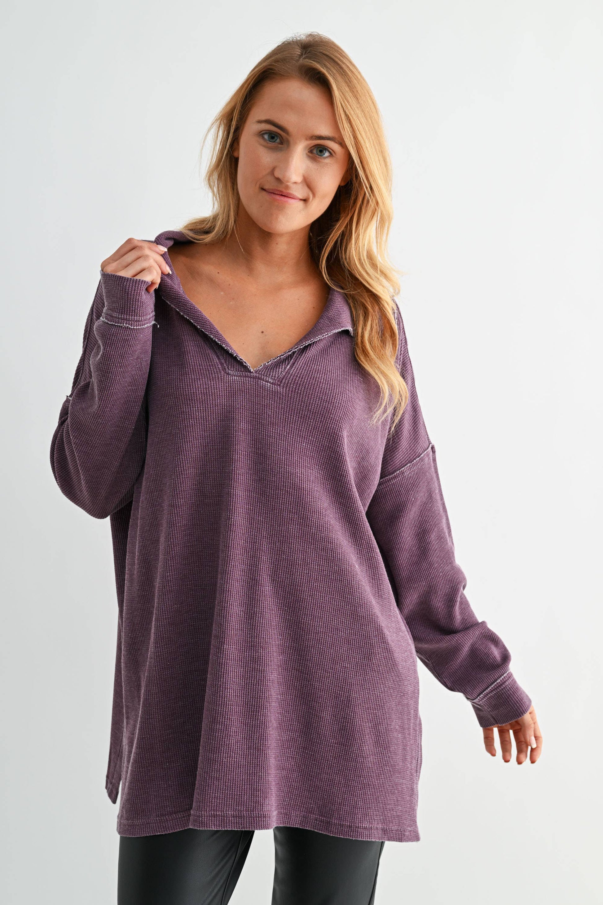 Blend effortless style with all-day comfort. Crafted from a soft, lightweight cotton-blend waffle knit, this long-sleeve top features a vintage-inspired mineral wash for a uniquely worn-in feel. The oversized collar adds a polished touch, while raw edge detailing at the shoulder and back seams enhances its relaxed, lived-in look. Cozy yet elevated, it’s perfect for layering or wearing solo—pair it with your favorite denim or leggings for a casual-chic outfit.