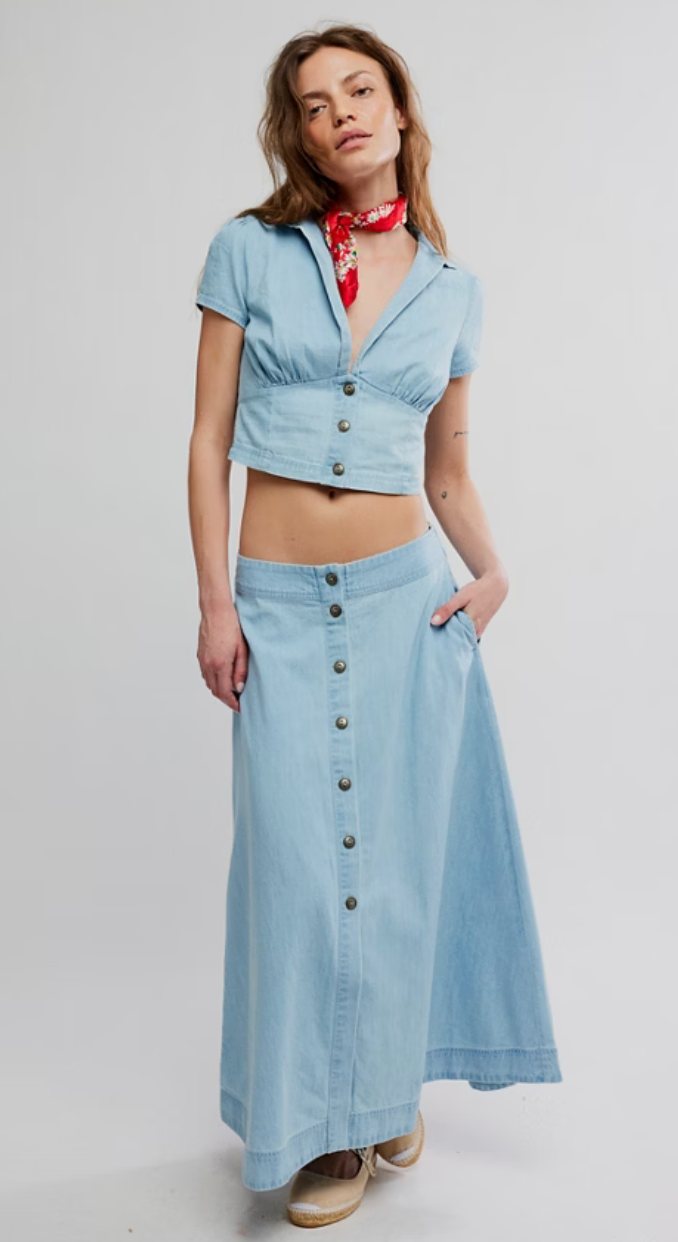 Effortlessly chic, this two-piece set combines a classic denim skirt with a coordinating top for a perfectly matched look. Inspired by Free People's laid-back aesthetic, the set features relaxed silhouettes and quality construction that transitions seamlessly from casual days to weekend adventures. Mix, match, or wear together for versatile styling options that work with your existing wardrobe.