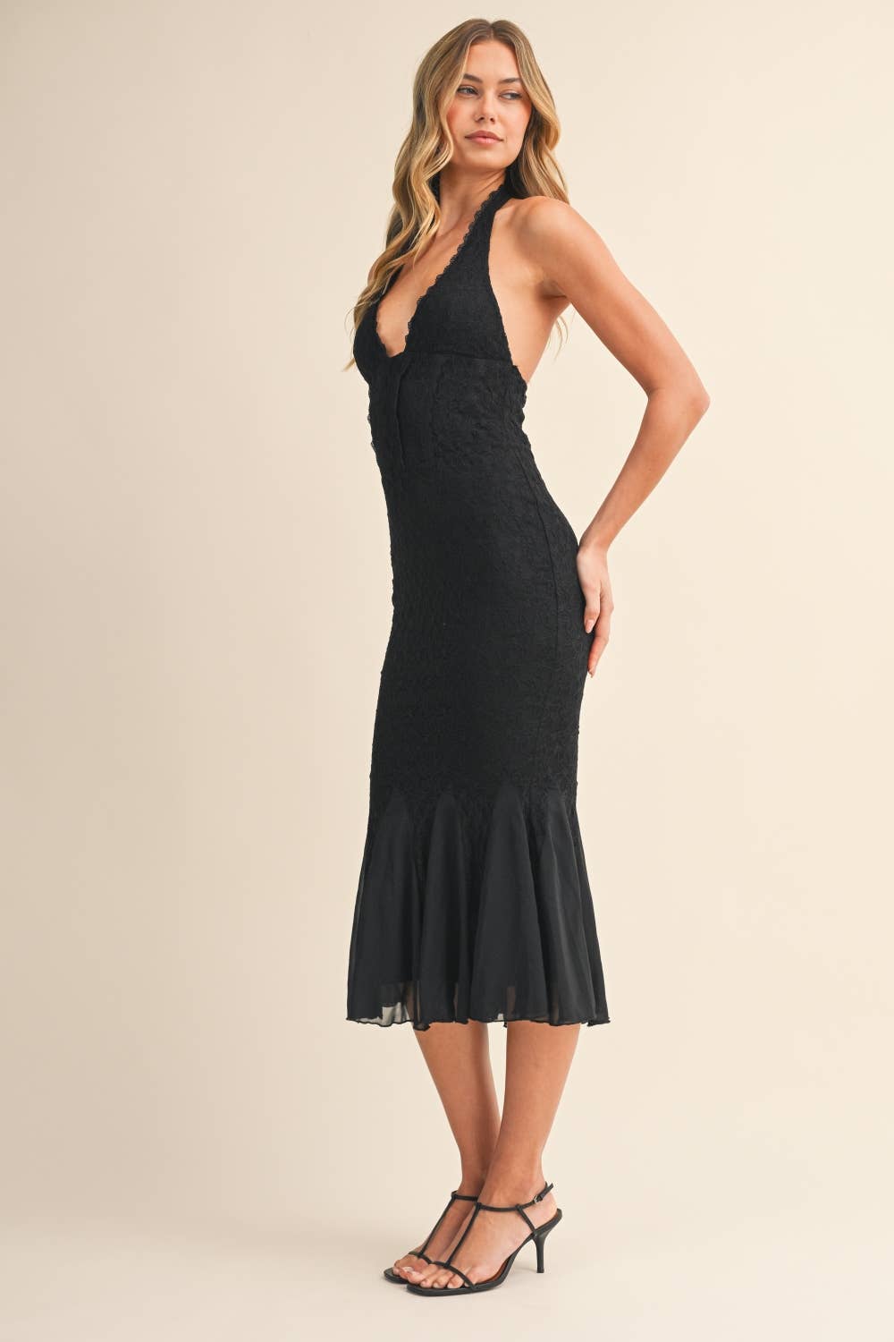 Elevate your evening look with this stunning stretch lace halter neck corset body midi dress. Featuring a flattering corset-style bodice and elegant halter neckline, this piece combines sophistication with comfort. The stretch lace construction moves with you, while the fully lined interior ensures a smooth silhouette. Perfect for special occasions, date nights, or when you want to feel confident and chic. The midi length offers timeless elegance with a modern edge.