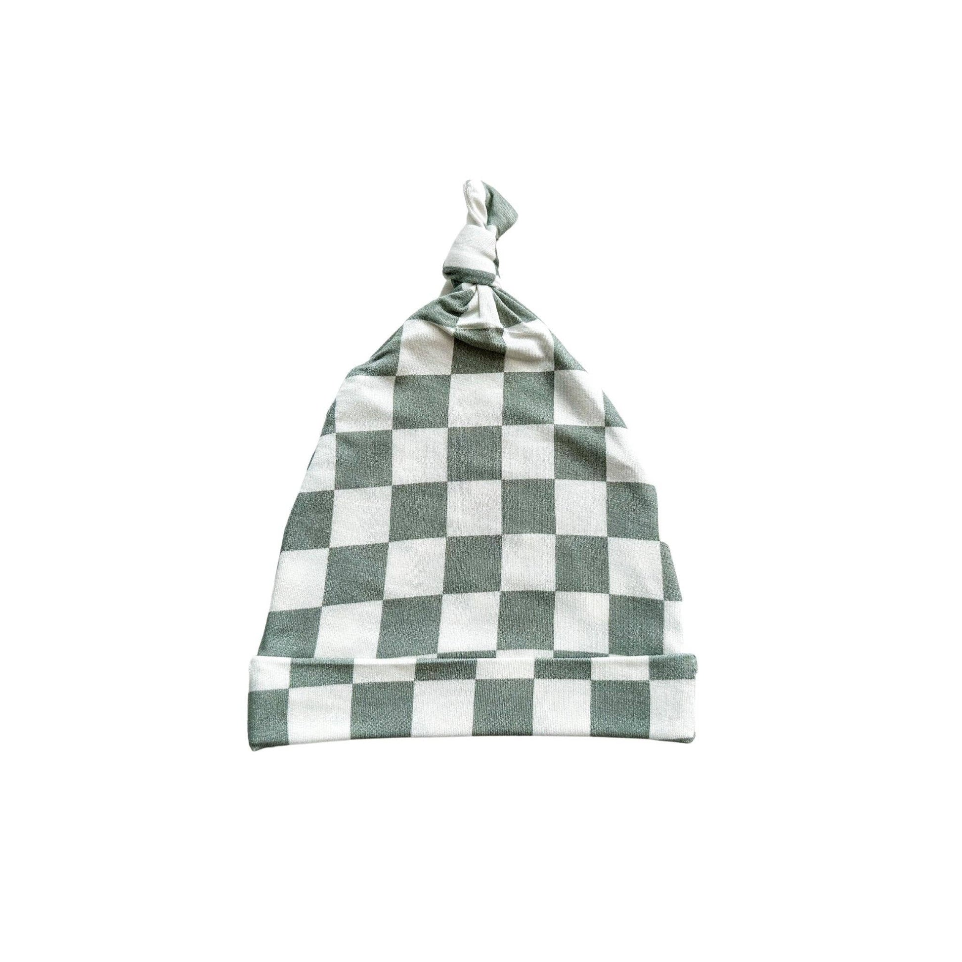 The Jade Checkered knot hat is super soft and comfortable! Comes in one size and fits newborn to 3 months depending on head size.