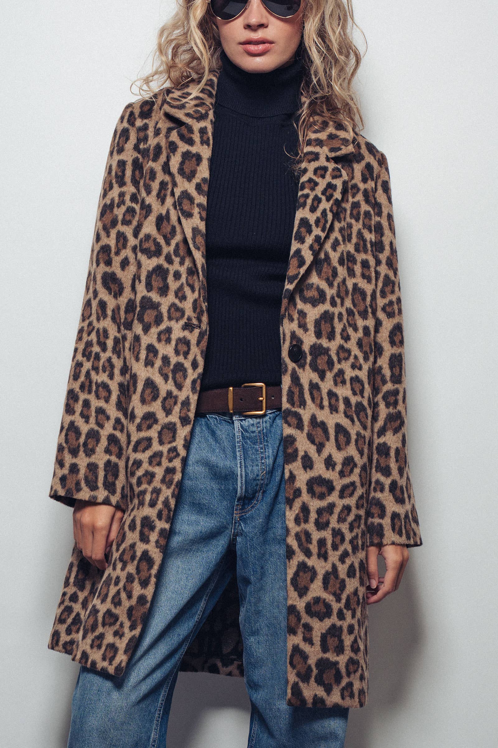 Bold leopard print coat in luxe soft-touch fabric with a slightly oversized fit for chic comfort. Perfect for layering over knits or turtlenecks on cool days. Fit: Measures approx. 19" bust, 39" length, 24" sleeve (size S). Slightly oversized for an effortless vibe.