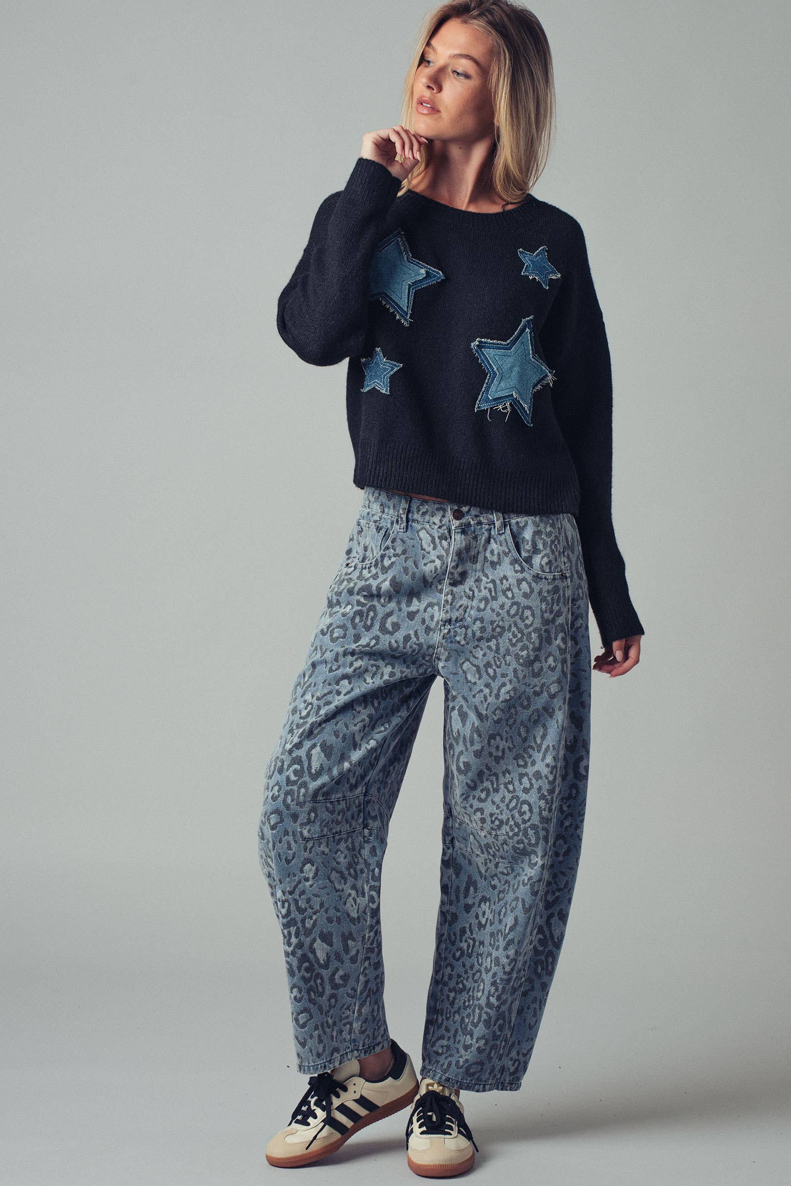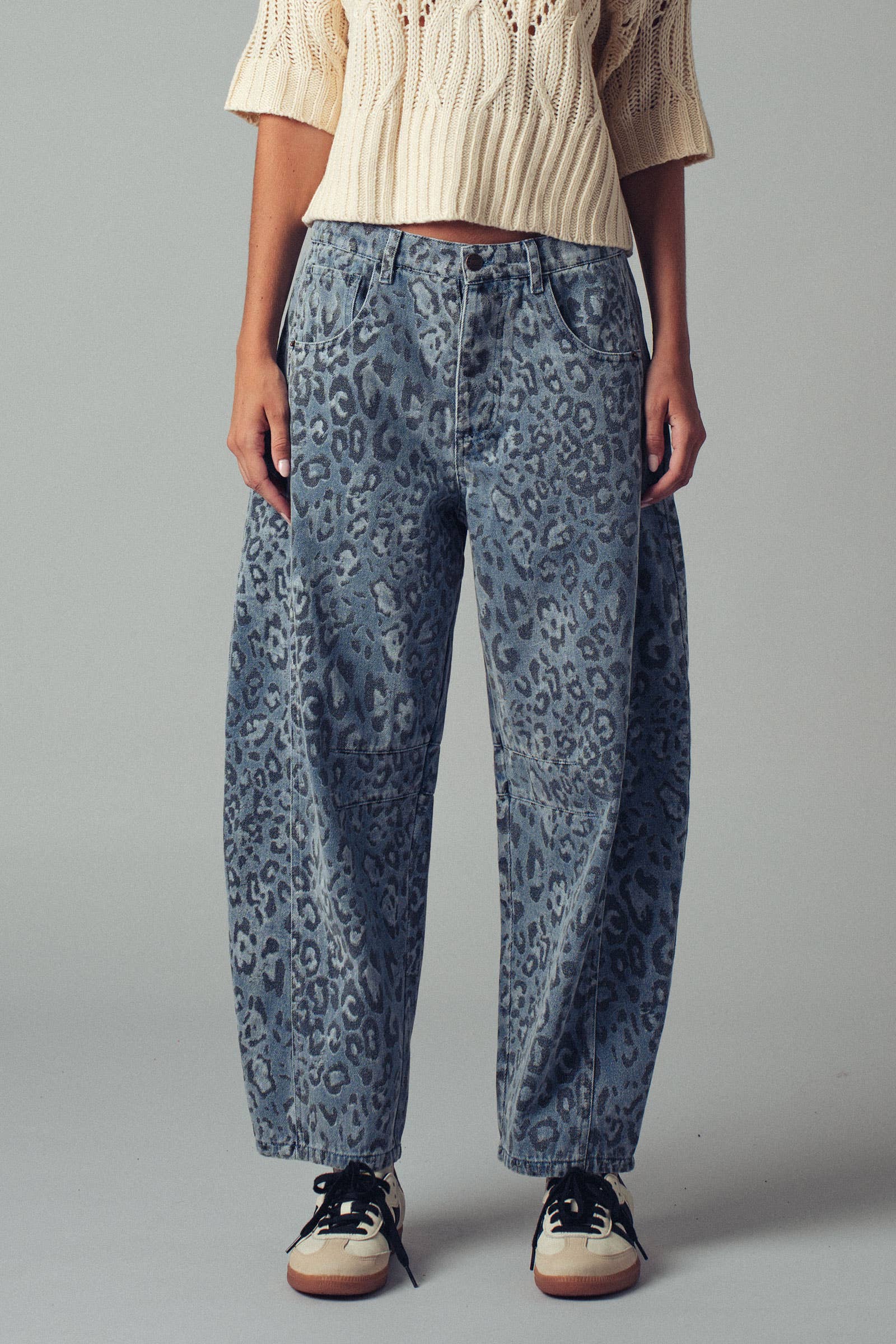 Make a bold statement in these relaxed-fit denim pants featuring a trendy camo-inspired leopard print. Designed in a soft cotton blend with a straight-leg silhouette and mid-rise waist—perfect for pairing with cropped tops or denim vests. Features: