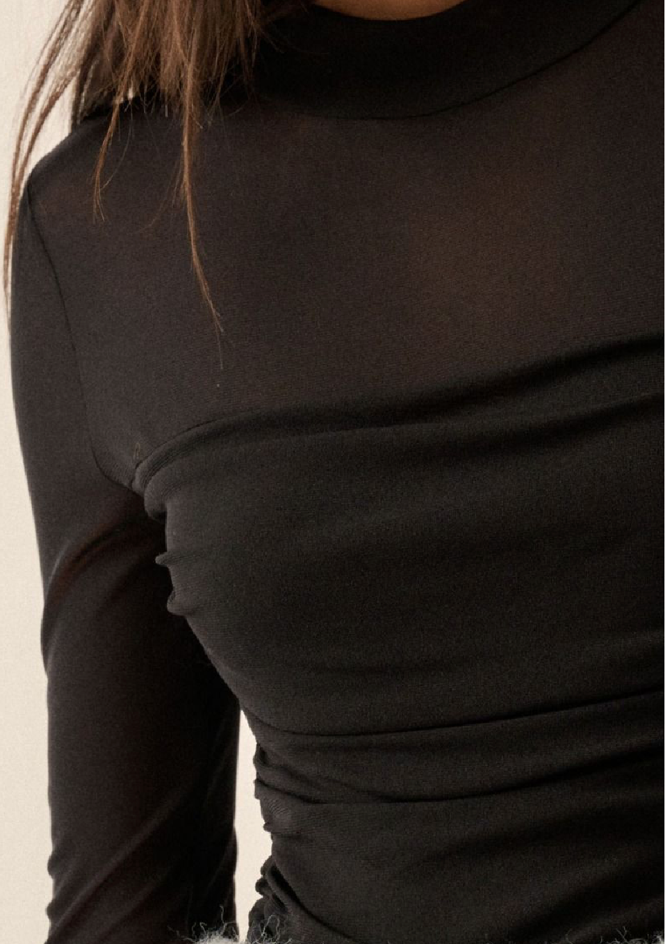 The Melanie Bodysuit is your go-to piece for effortless edge and allure. Crafted from a luxe knit blend, this fitted number features a striking high neckline and delicately ruched bodice that flatters your curves. Long sleeves are finished with playful ruffle cuffs for that extra touch of sass, while sheer mesh panels keep things flirty and fun. The partial lining offers comfort where it counts, and the snap crotch design makes getting ready (and undressing) a breeze. Perfect for layering under sheer tops or wearing solo for a bold statement.