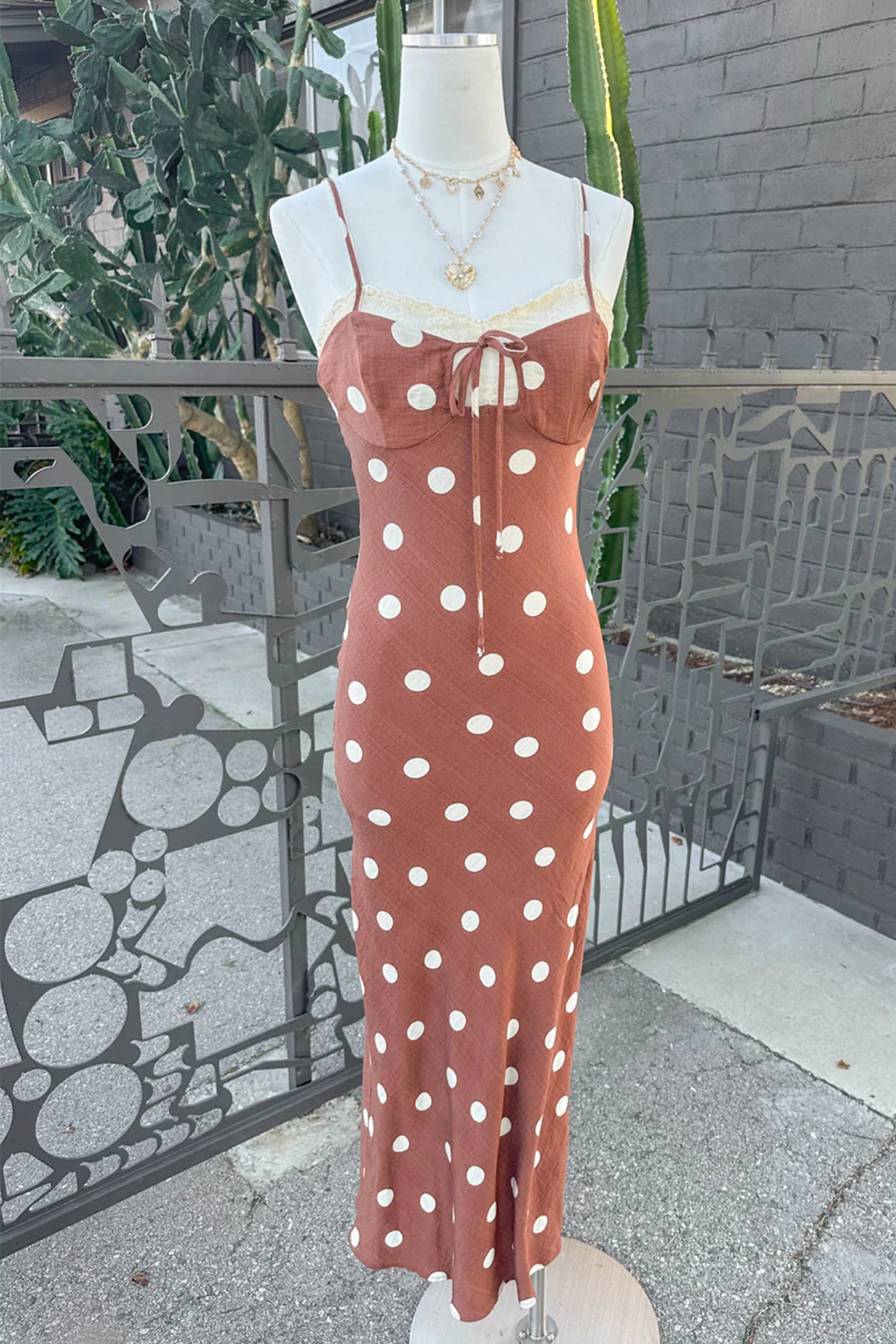 Twirl into the spotlight in the Kylie Maxi Dress, where retro charm meets modern edge. This playful polka dot stunner features an open back with a secure clasp and zipper, adjustable straps for the perfect fit, and a flirty tie-front detail that lets you customize your look. Whether you're heading to a festival, date night, or weekend adventure, this dress brings fun, femininity, and just the right amount of sass to any occasion.