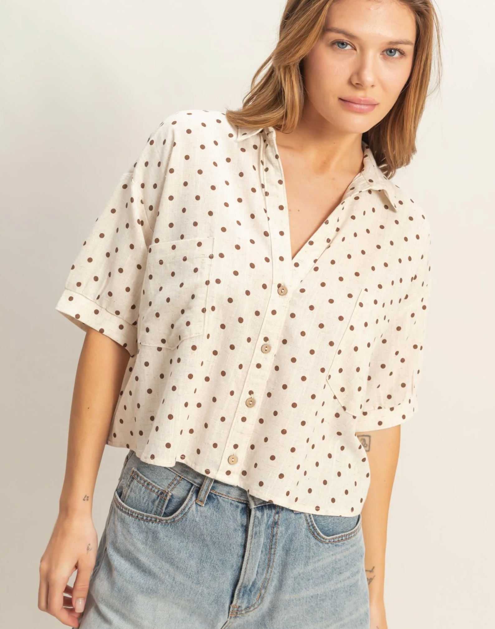 A relaxed fit button-up shirt with polka dot pattern and short sleeves. Features a classic collar and front pockets. Pair with distressed denim shorts for a casual look.
